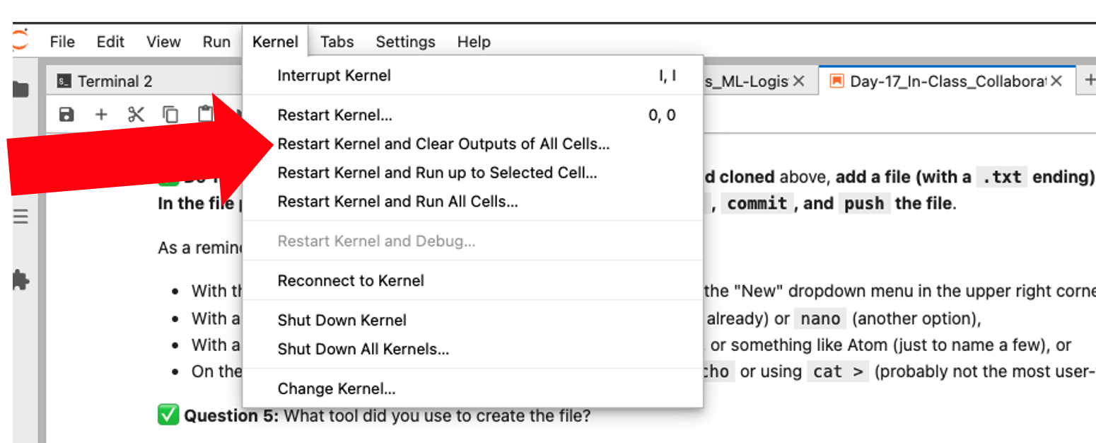 .ipynb(Jupyter notebook) file. You should always try to clear the output from that file before you commit your changes. This helps to ensure that the output content is not being tracked by git since this content can be large and may include code that presents output images, clutters the code base. To clear the output, do the following:In the notebook click on “Kernel” -> “Restart & Clear Output”. Wait for that to finish (shouldn’t take long) then save the file (this is important)