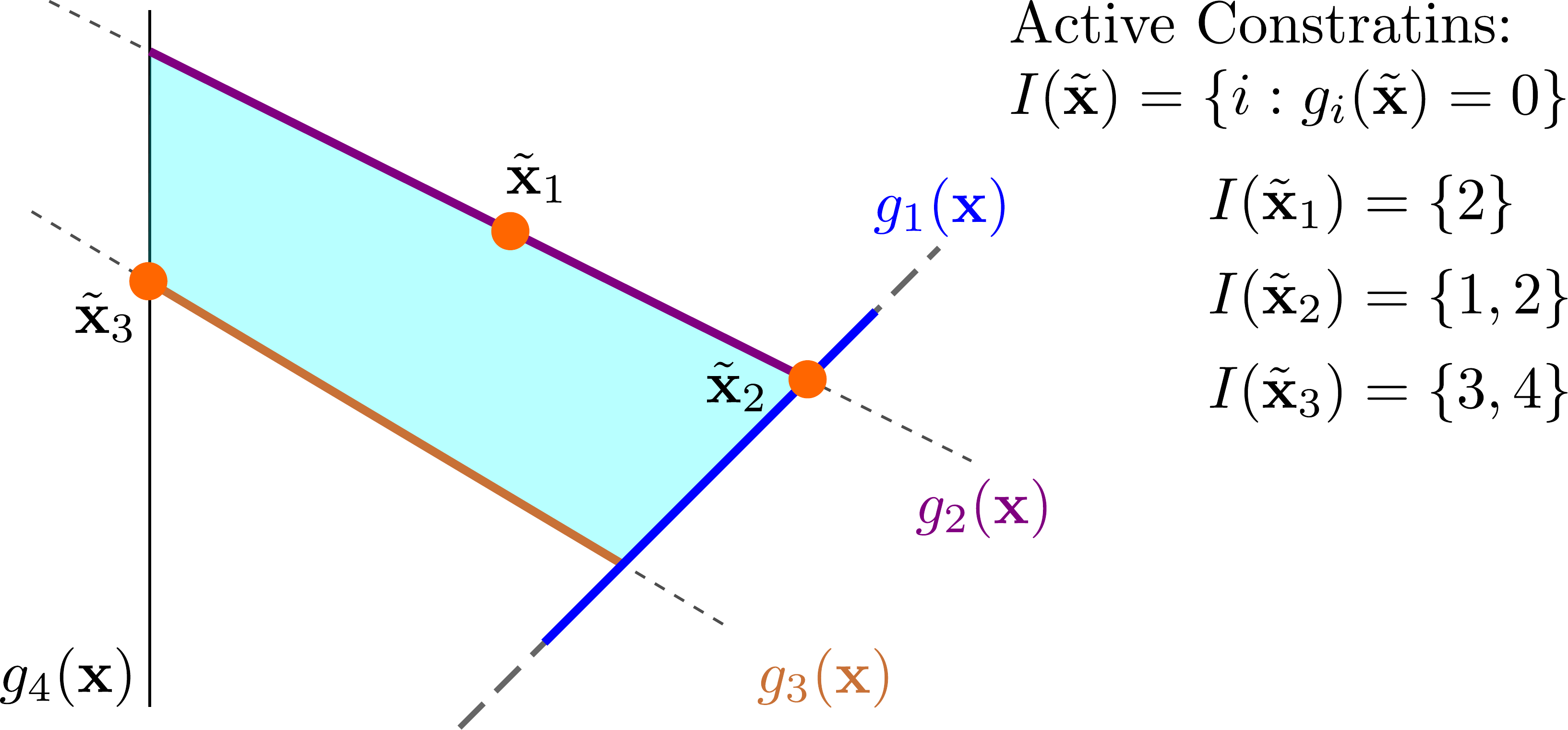 where \(g_i:\mathbb{R}^n \to \mathbb{R}\) are functions, and a vector \(\tilde{\mathbf{x}} \in \mathbb{R}^n\), the active constraints at \(\tilde{\mathbf{x}}\) are the constraints satisfied as equalities at \(\tilde{\mathbf{x}}\). The set of active constraints is denoted by