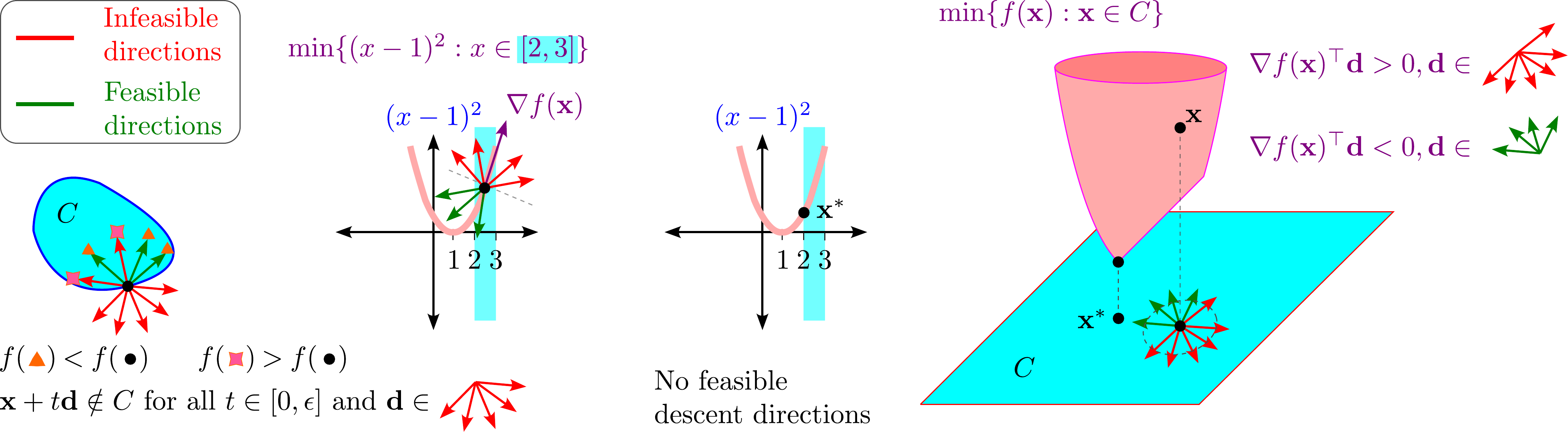 Then a vector \(\mathbf{d} \neq 0\) is called a feasible descent direction at \(\mathbf{x} \in C\) if