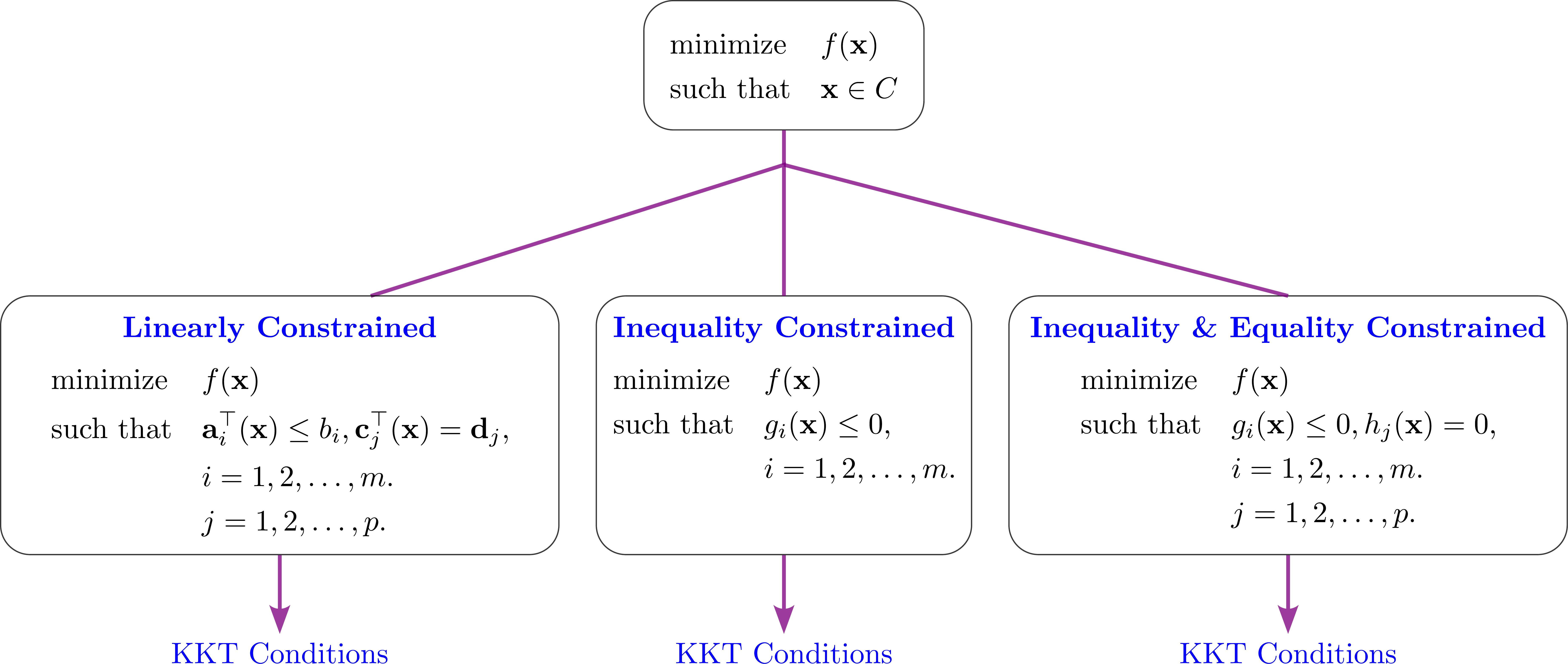 where \(f,g_1,\ldots,g_m,h_1,h_2,\ldots,h_p\) are continuously differentiable functions over \(\mathbb{R}^n\).