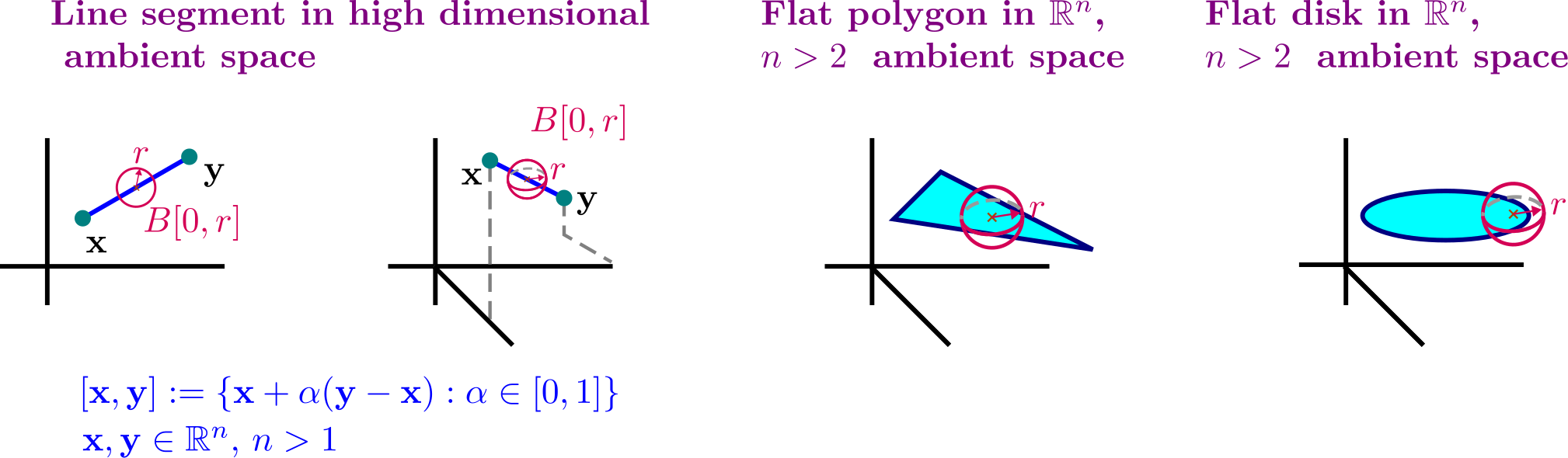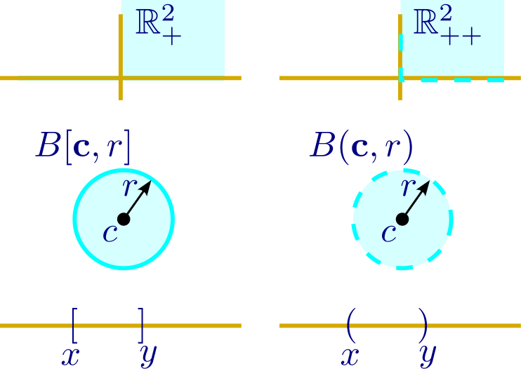 Closed and open line segments between two different points \(\mathbf{x}, \mathbf{y}\in\mathbb{R}^n\):