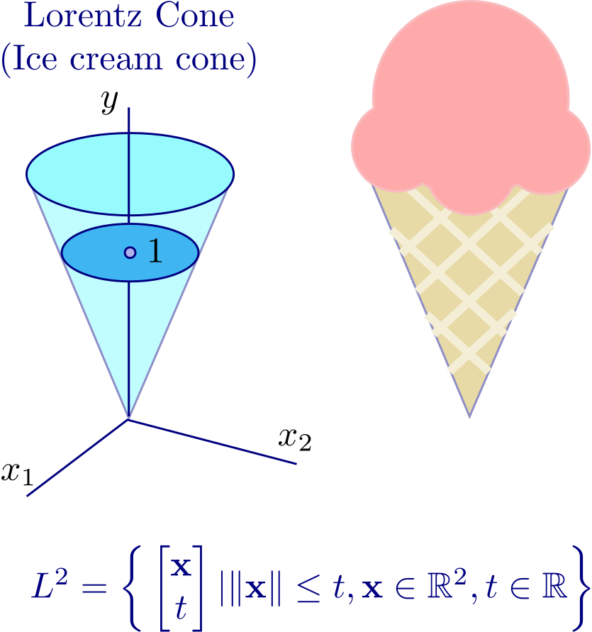 (e) The Lorentz (second-order) cone: \(S = \{(x_1, x_2, y) \in \mathbb{R}^3 \mid \|(x_1, x_2)\|_2 \le y\}\)