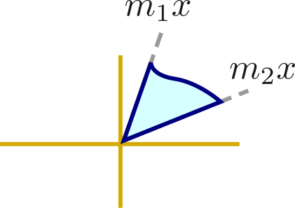 (b) \(S = \{(x,y) \in \mathbb{R}^2_+ \mid y \le m_1 x \text{ and } y \ge m_2 x\}\)
