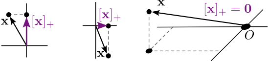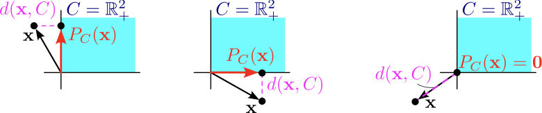 Let \(C=\mathbb{R}^n_{+}\). The orthogonal projection of \(\mathbf{x} \in \mathbb{R}^n\) onto \(\mathbb{R}^n_{+} = \{\mathbf{y} \in \R^n \mid y_i \geq 0 \; \forall i\}\) is