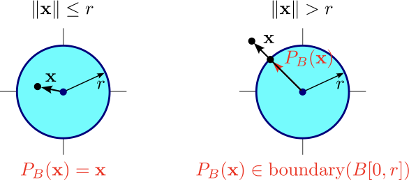 Let \(C=B[\mathbf{0},r]=\{\mathbf{y}:\|\mathbf{y}\leq r\}\). The projection of \(\mathbf{x}\) onto \(C\) is
